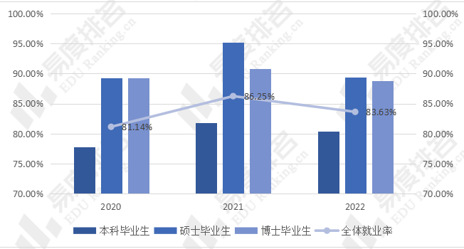 西农毕业生就业率在985高校中处于下游水平,就业状况也起伏不定。西农2020年本科毕业生就业率跌破80%,仅77.75%,尽管近两年就业情况有所回暖,但22年的就业率仍只有80.35%,本科就业形势十分严峻。