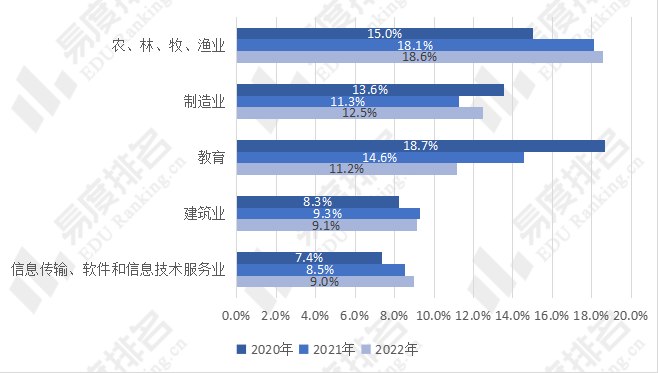西农作为一所农林类高校,其全体毕业生的就业行业以农、林、牧、渔业为主,该行业的就业热度在逐年上升。2020年教育行业的就业热度超过农、林、牧、渔业,但受“双减”政策的影响,其就业热度在不断下降。