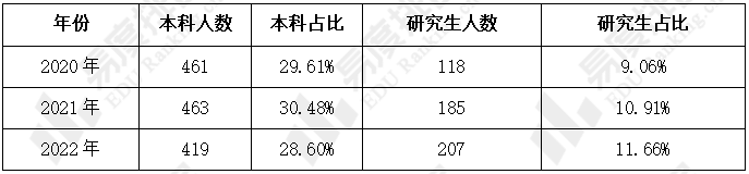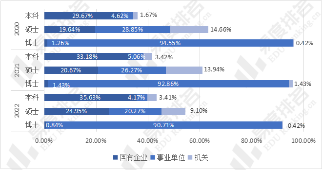 将国有企业、事业单位、党政机关视体制内就业。本科毕业生体制内就业热度逐年升高,越来越多的本科毕业生选择进入国有企业;硕、博毕业生体制内就业热度有所下降,进入事业单位的人数占比逐年减少。