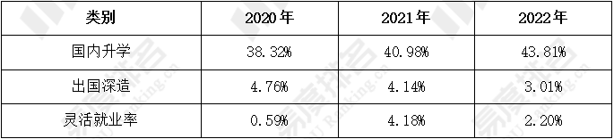 受就业压力的影响,西农本科毕业生的升学热情逐年增加,三年间国内升学率上涨超5个百分点,出国深造率下降仅1.75%。学校灵活就业率波动较大,但灵活就业率并不算高。