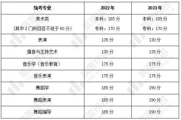 辽宁省美术类、音乐学、音乐表演专业统考合格线与去年持平,其中美术类本科专业统考合格分数线为185分,且3门科目中至少有2门各不低于60分;专科专业统考合格分数线为170分;音乐学、音乐表演专业须参加音乐基础课考试,音乐基础课笔试合格分数线为45分。