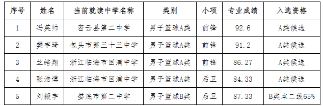 我校2023年高水平运动队(男子篮球)的专项测试已完成,考生可登录成绩查询系统(网址:https://examination.xmu.edu.cn/chaxun/login/)查询专业测试成绩。根据《厦门大学2023年本科生高水平运动队和保送录取运动员招生简章》,按照全面衡量、择优录取的原则,分类别(A类、B类)划定我校2023年高水平运动队(男子篮球)专业测试最低控制分数线为:A类84.33分,B类87.33分。现将入围候选资格名单予以公示,公示期截止3月9日。公示期内如有异议请向我校招生与考试办公室(联系电话:0592-2188888)或学校纪检监察机构(联系电话:0592-2186219)反映。注:入围“A类候选”资格的考生:参加国家体育总局统一组织的运动训练、武术与民族传统体育专业单独招生文化课考试,成绩达到我校届时划定的文化合格分数线的考生将最终入选我校高水平运动队A类资格。