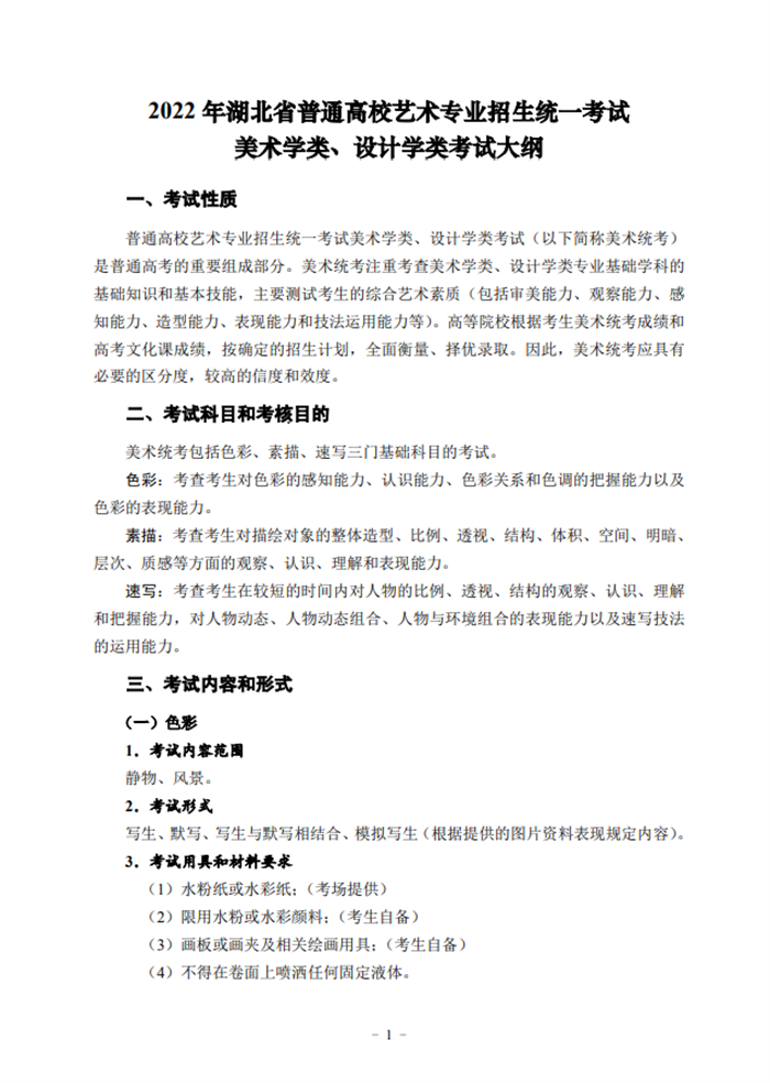 文章来源:湖北省教育考试院 2022年湖北省普通高校艺术专业招生统一考试 美术学类、设计学类考试大纲