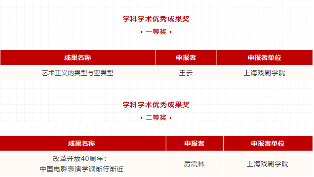 近日,《关于表彰上海市第十五届哲学社会科学优秀成果奖的决定》发布。经上海市哲学社会科学优秀成果评奖委员会审议通过,市委宣传部、市人力资源社会保障局决定,对150项获奖成果予以表彰,其中学术贡献奖4项、一等奖39项、二等奖107项。上海市哲学社会科学优秀成果奖是本市哲学社会科学最高奖项,每两年评选一届。 上海戏剧学院有两项目成果进入表彰名单,分别是王云教授的《艺术正义的类型与亚类型》(学科学术优秀成果奖论文类一等奖)和厉震林教授的《改革开放40周年:中国电影表演学派渐行渐近》(学科学术优秀成果奖论文类二等奖)。