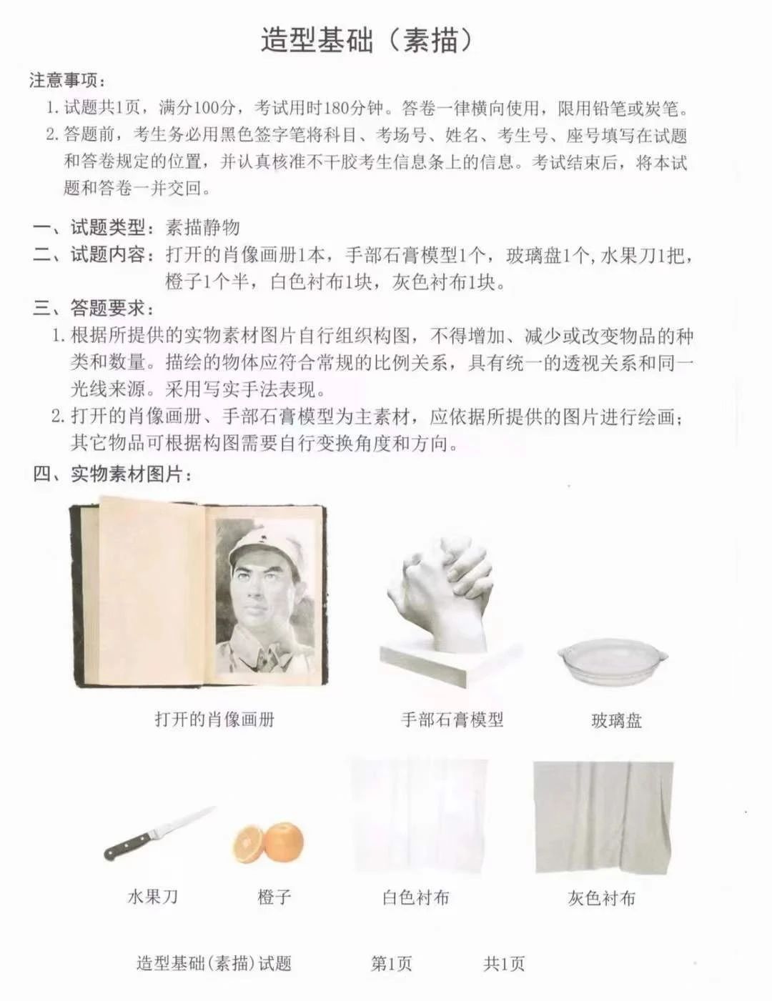二、试题内容:打开的肖像画册1本,手部石膏模型1个,玻璃盘1个水果刀1把,橙子1个半,自色村布1块,灰色衬布1块。