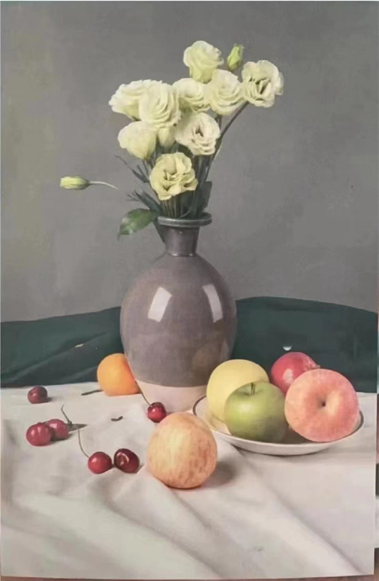 考试内容:临摹照片,深色半釉陶瓶,一束花,白色瓷盘,红苹果、青苹果、橘子、樱桃若干,一块白色衬布,一块绿色衬布。