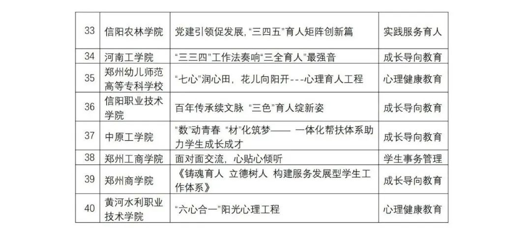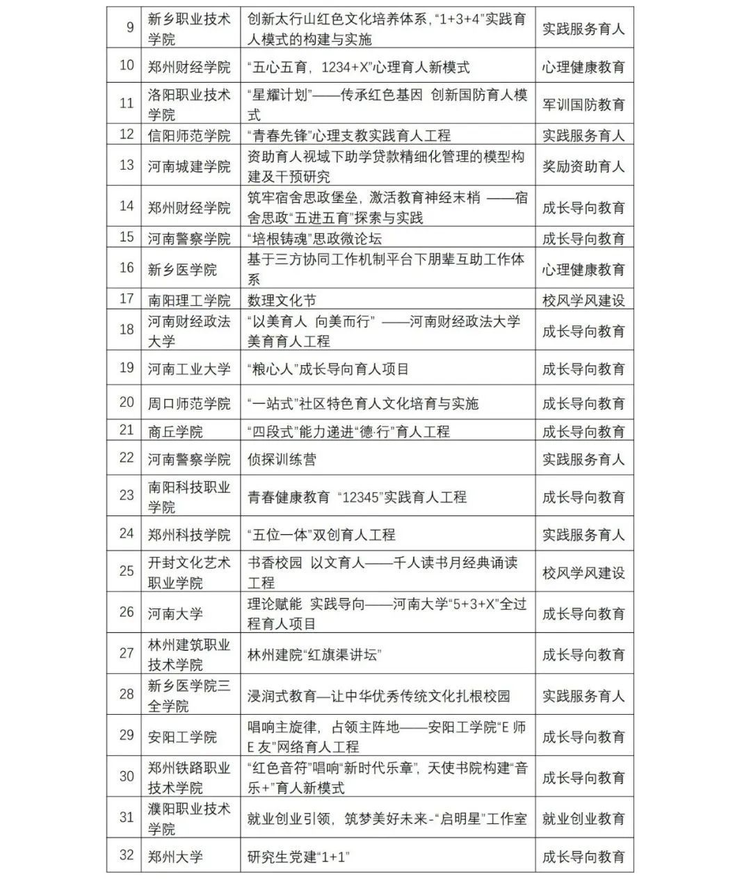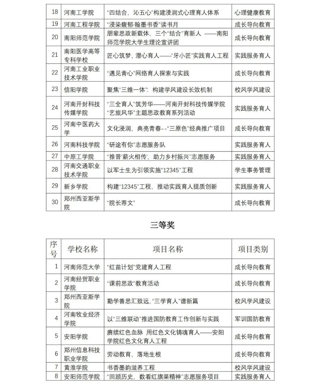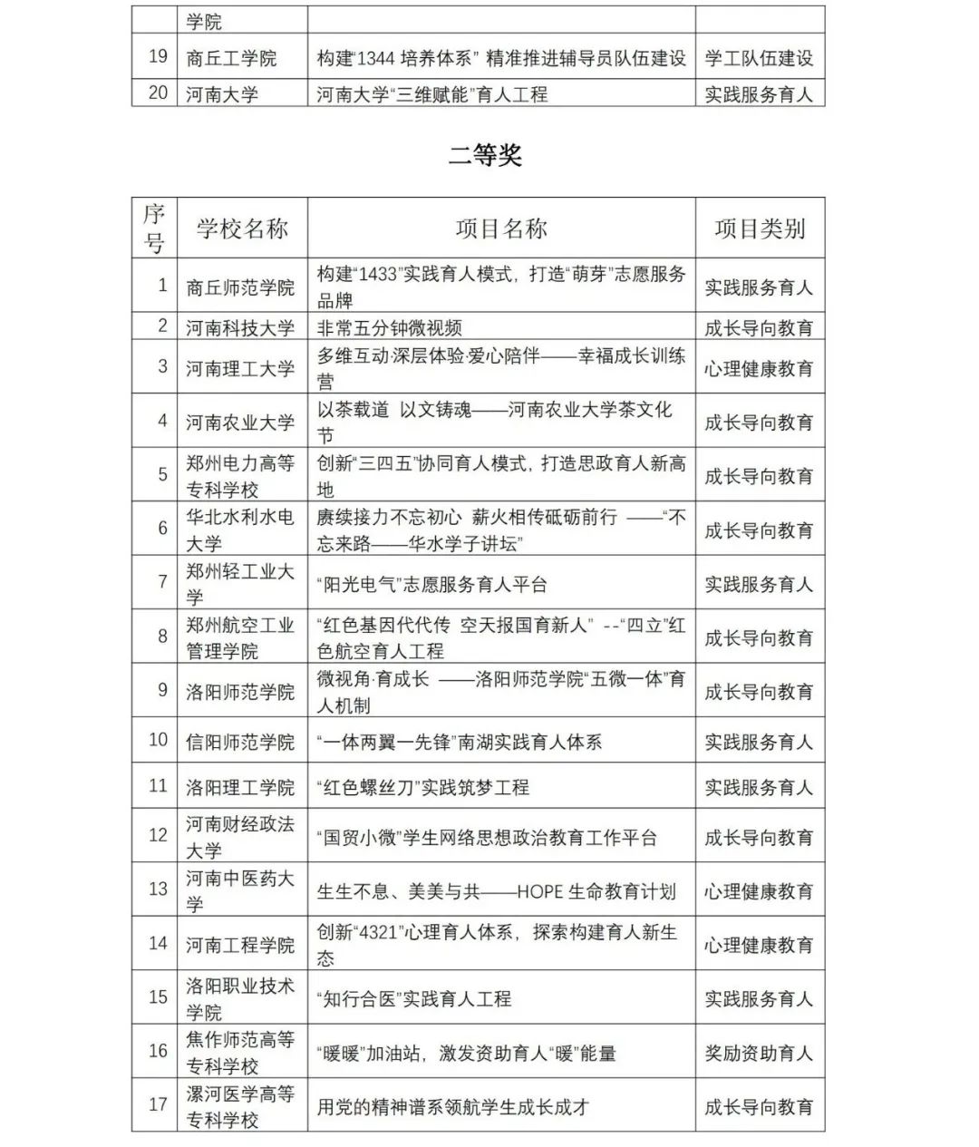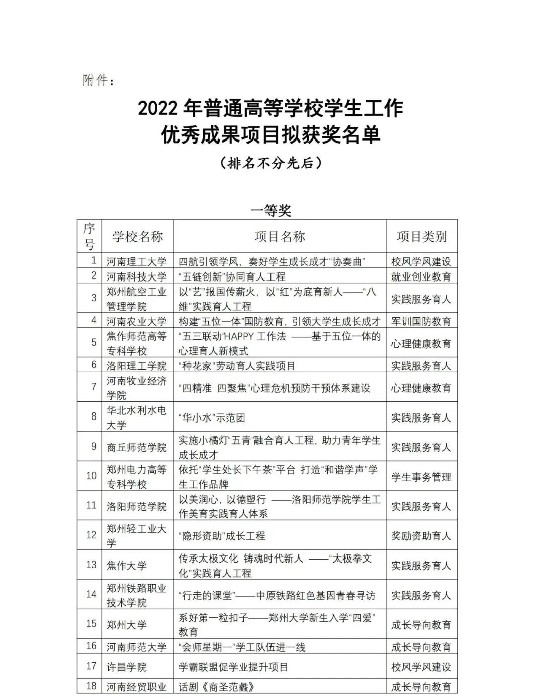 根据《河南省教育厅办公室关于组织开展2022年普通高等学校学生工作优秀成果项目评选的通知》(教办学〔2022〕401号)要求,经各高校推荐,省教育厅组织专家评审,通过网络评审、专家评议、现场展示、专家终审等环节,评选出2022年普通高等学校学生工作优秀成果项目一等奖20名、二等奖30名、三等奖40名。现将获奖名单予以公示(名单见附件)。