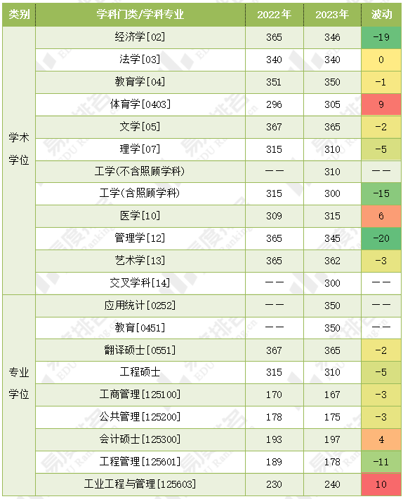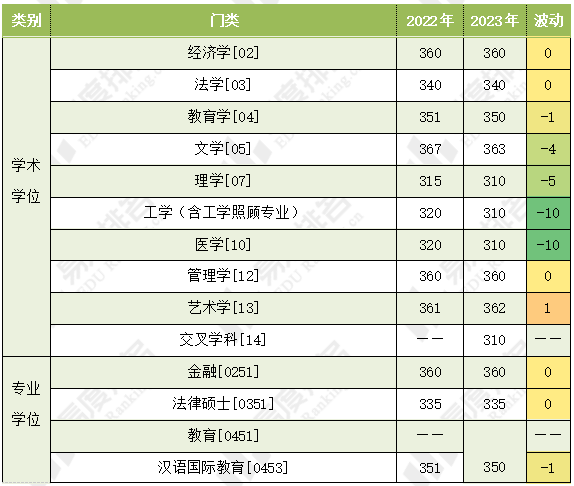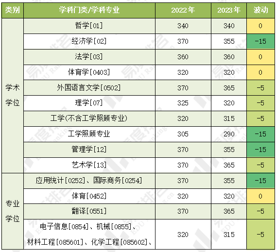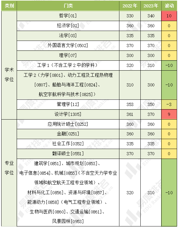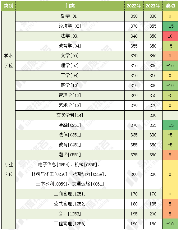 哈工大仅哲学、设计学复试线有所上涨,分别上涨10分、9分;经济学、法学、理学、文学相关专业复试线与去年保持一致。
