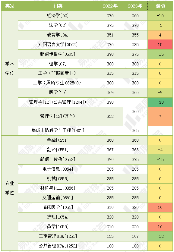 2023年电子科大不再将公共管理[1204]专业单独划分复试线,该专业的复试线下降了30分;外国语言文学复试线上涨15分,成为2023年复试线最高的专业;医学专硕热度有所上升,临床医学[1051]、药学[1055]均上涨10分。