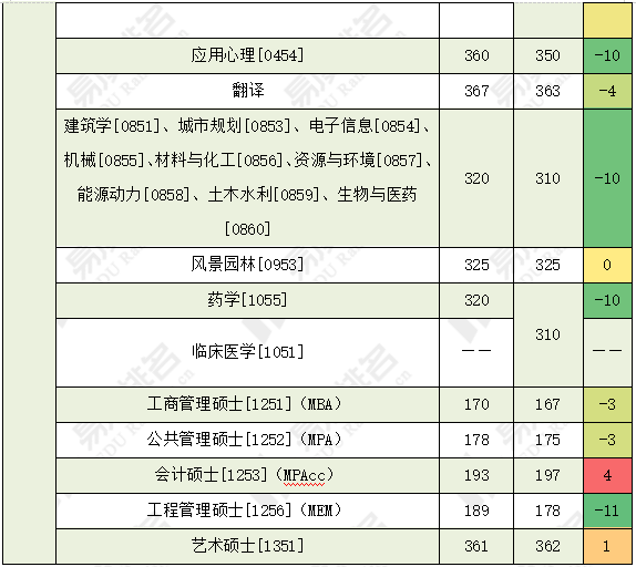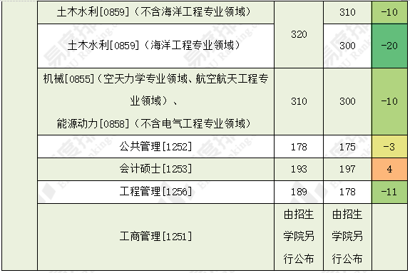 哈尔滨工业大学复试线下滑的专业主要集中在工学、管理学。工学所有专业复试线均下降,下降分数介于10-20分之间;管理学除会计硕士[1253]复试线上涨4分外,其他专业复试线均下降,下降分数介于0-11分之间。