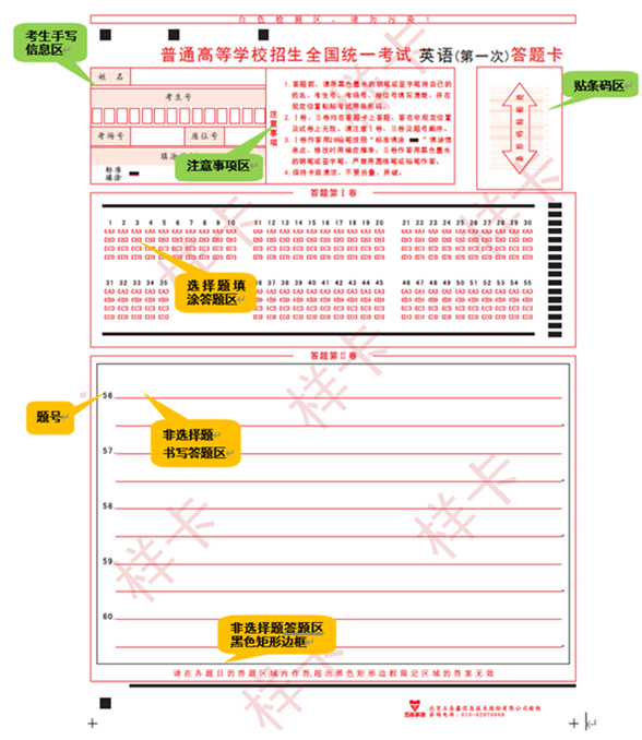 (1)考生信息:①考生手写信息区(含由考生本人书写的姓名、考生号、考场号、座位号等);②贴条形码区;③注意事项(考生必须仔细阅读其内容)。