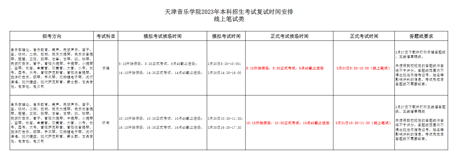天津音乐学院2023年本科招生考试复试时间安排(线上笔试类)