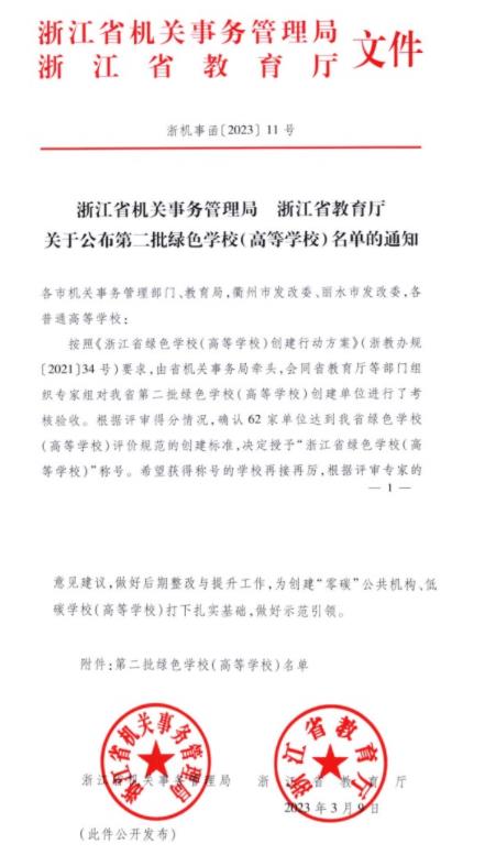 近日,浙江省机关事务管理局、浙江省教育厅公布第二批绿色学校(高等学校)名单,
