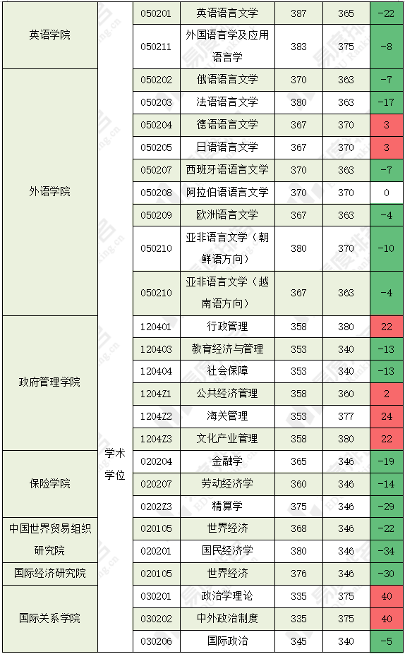 对外经济贸易大学复试线“20升56降”,经济学统考专业复试线全面下降。西方经济学、国民经济学等多个经济学专业的复试线下降超30分,能源与低碳经济学分数下降最多,为38分;单独考试竞争逐渐激烈,国际贸易学(单独考试)上涨47分。