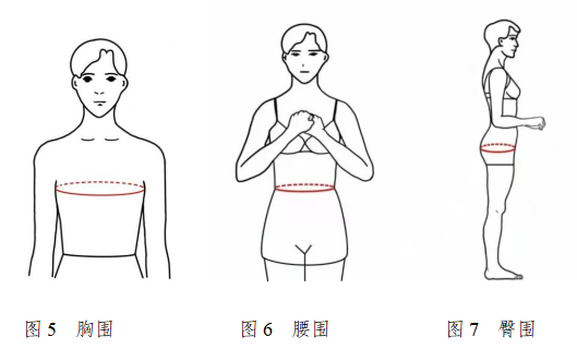 考生直立,两脚并拢,正常呼吸,腹部放松。测量人员测量胯骨上端与肋骨下缘之间腰际线(即躯干中间最细部位)的水平围长。测量时均匀呼吸,不可过度呼气与吸气、收腰,以免影响测量结果(见图6)。