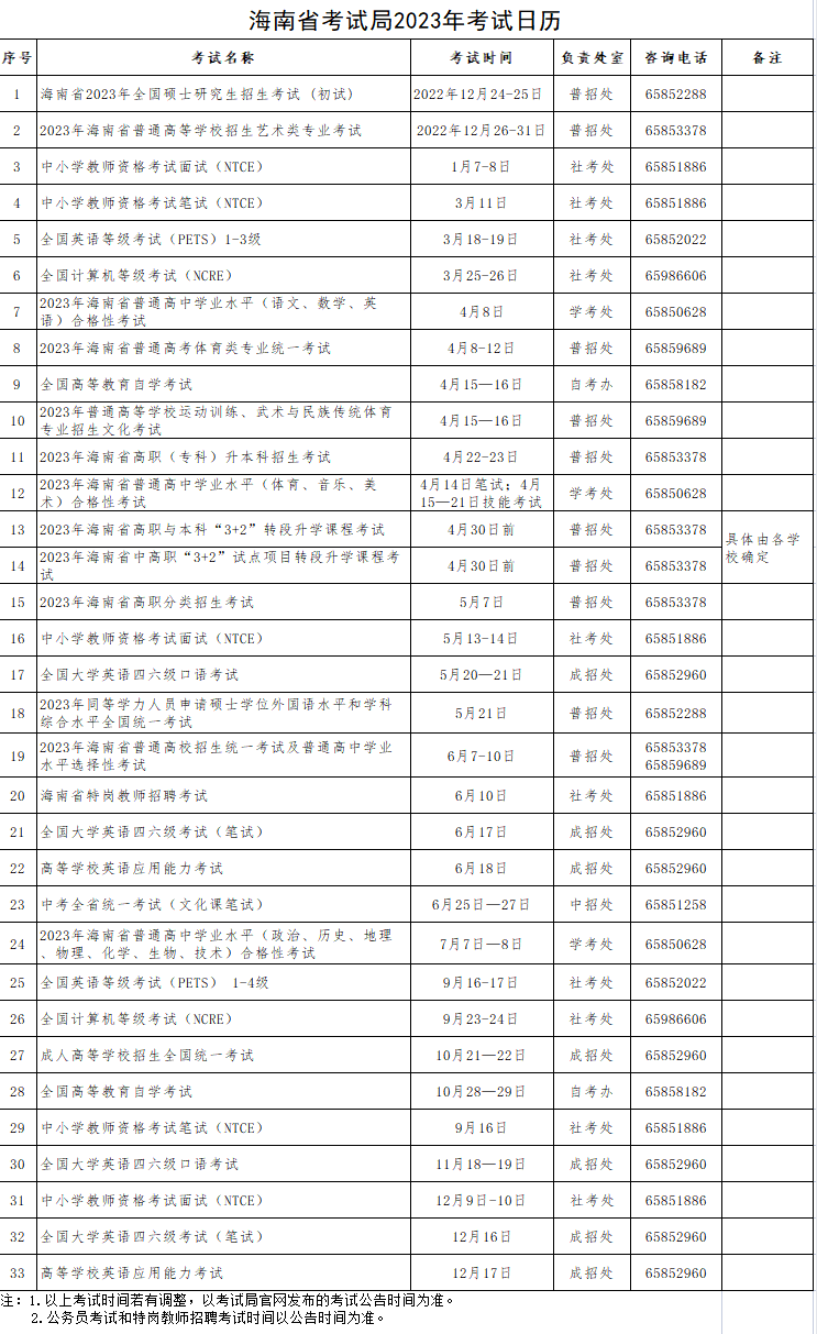 海南省考试局2023年考试日历