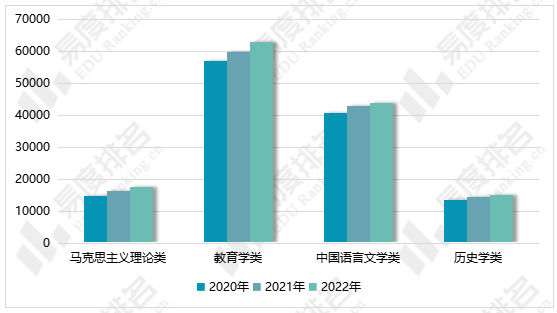 学前教育、小学教育招生人数的下降暂时并未影响相应师范类本科专业的招生。2022年,教育部等八部门联合印发《新时代基础教育强师计划》,“强师计划”指出我国中小学教师拥有研究生学历的占比仍相对过低,与新时代教育事业改革发展需求仍不相适应。因此,高学历师资的建设是现阶段教育改革的重点。