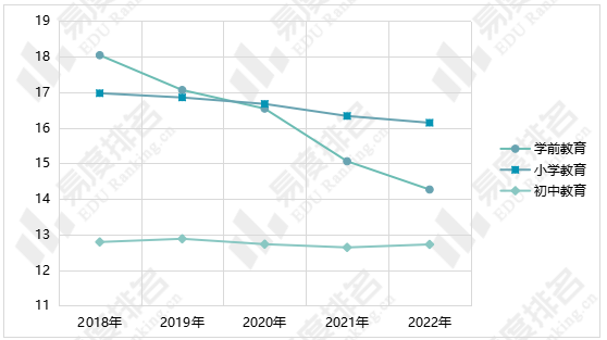 学前教育生师比由2018年的18:1下降至14:1,小学教育阶段生师比暂保持在16:1-17:1,但已呈现下降趋势。出生率的降低暂未影响到初中阶段。