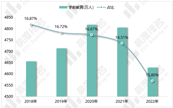 2018-2020年,各级各类学校数及在校生人数保持稳定增长,2021年各级各类学校数减少将近8000所,在校生人数增幅跌至1%以下。2021年学前教育在校生人数减少13万,2022年减少超100万,学前教育在园人数占各级各类教育总人数的比重逐年下跌。