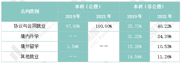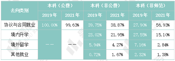 公费师范生因培养特性稳就业,与其他相近的普通师范生和普通专业相比,其就业情况会有明显差距。除少数违约学生,华东师范大学和华中师范大学公费师范生几乎100%协议就业,而非公费生签约就业率多在40%左右。在就业竞争力上,普通师范生甚至可能会弱于普通专业本科毕业生,2021年华中师范大学普通专业本科生超半数签约就业,签约就业率远超普通师范生。