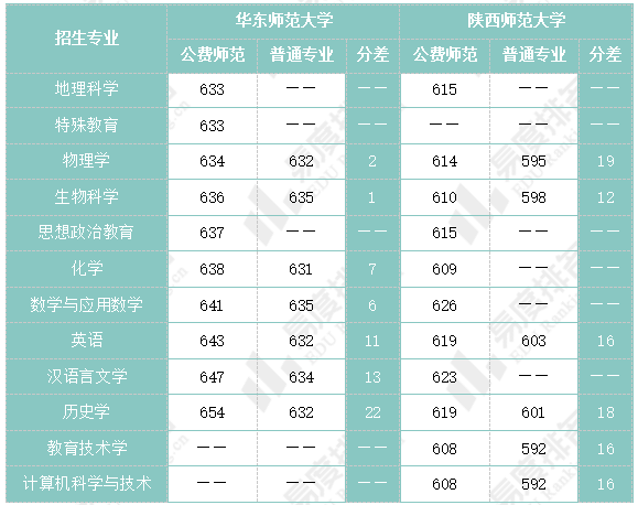 华东师范大学和陕西师范大学均为教育部直属的师范类高校,同属于我国顶尖师范类院校行列。公费师范生由于是定向就业型专业,其生源质量明显优于普通专业,两类专业的普遍分差超过10分。