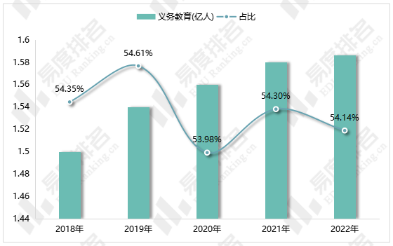 义务教育阶段的在学人数近年相对保持稳定增长,在学人数占比保持在54%左右。但普通小学招生人数自2020年起开始下降,近年入学人数增长率在-5%~0%。