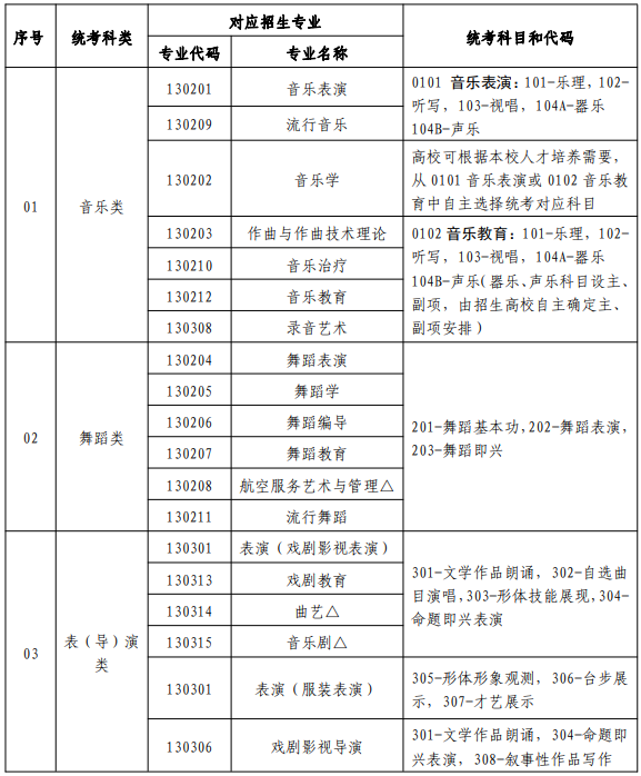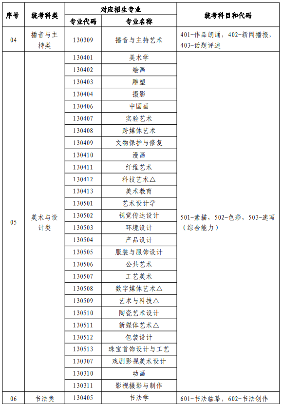 宁夏回族自治区普通高等学校艺术类本科招生专业与统考科类对应关系一览表(试行):
