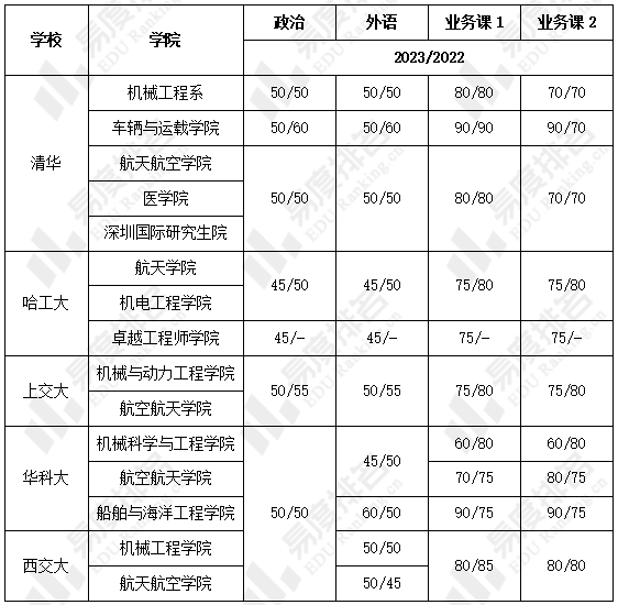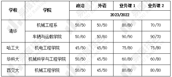 机械五虎中,对业务课要求最高的是清华的车辆与运载学院,两门业务课都要大于90分。而对业务课要求最低的是华科大,两门业务课都要大于60分。