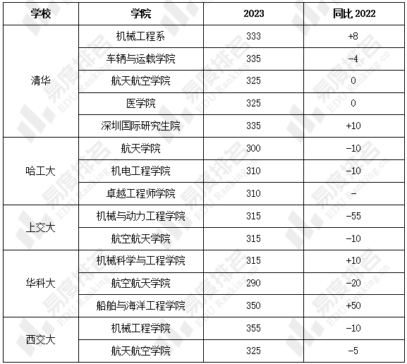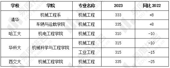 在2023年的研究生统考中,机械五虎中仅清华上调学硕分数线,其他三个院校不同程度下调学硕分数线,下调最多的院校为西交大,下调25分。同时,西交大和清华的车辆与运载学院的复试线最高,为335分,哈工大的复试线最低,为310分。