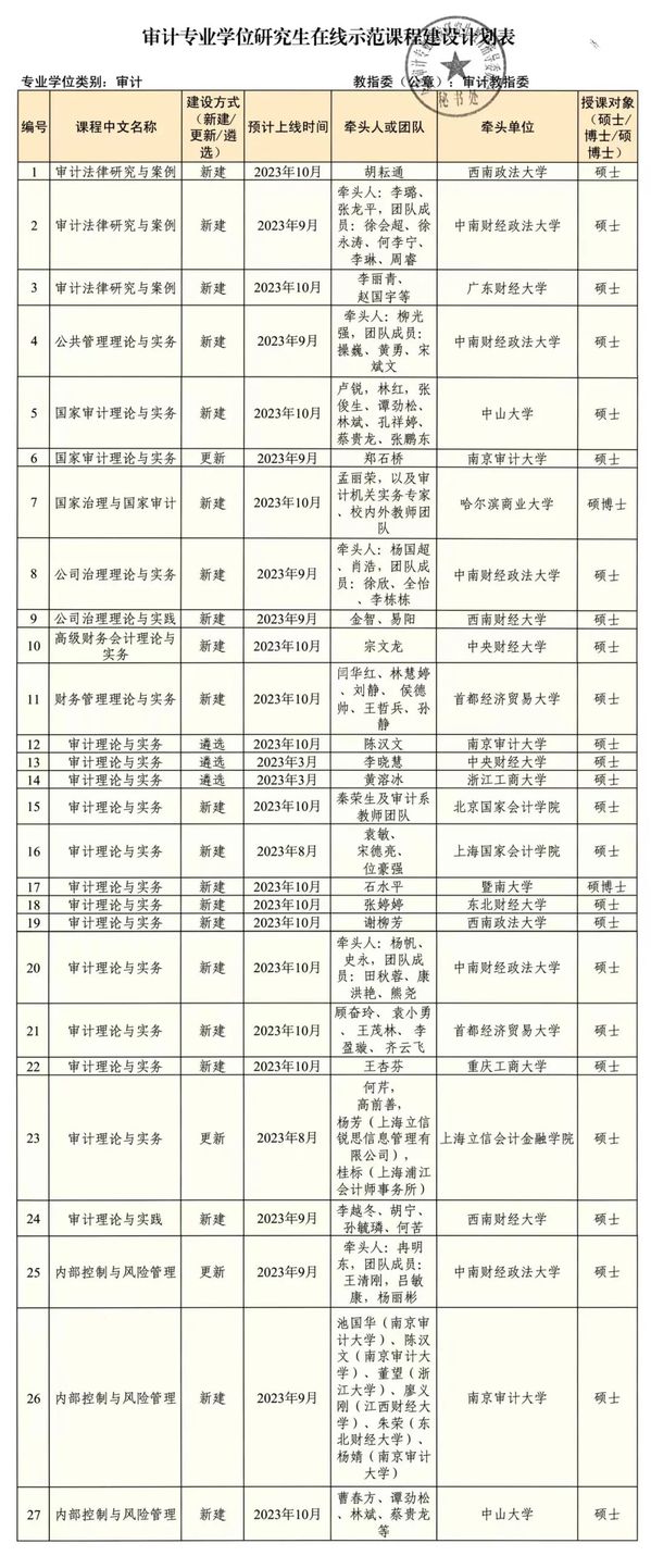 此次四门课程入选全国首批审计专业和会计专业学位研究生在线示范课程建设计划,充分展现了南京审计大学在审计专业硕士项目(MAud)、会计专业硕士项目(MPAcc)的教学改革成效和课程建设成果,也将进一步提升我校审计学科在全国审计、会计学科领域的知名度和影响力。