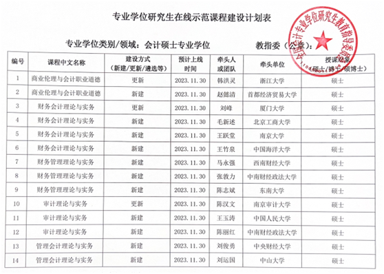 近日,全国会计专业学位研究生教育指导委员会和全国审计专业学位研究生教育指导委员会先后公布了首批专业学位研究生在线示范课程建设计划表。经过评审,我校四门课程入选,其中三门课程由内部审计学院教授主持。