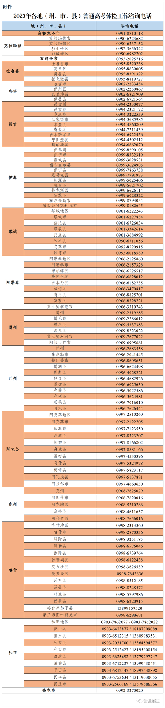 附件:2023年各地(州、市、县)普通高考体检工作咨询电话