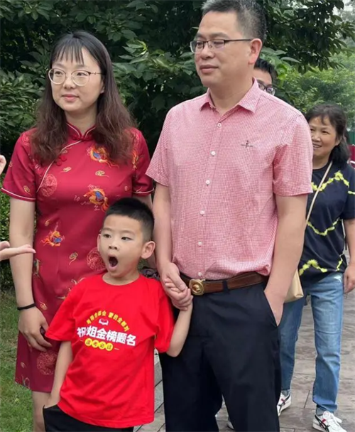 送考家长穿一身红来到学军中学门口,笑着送儿子进考场。
