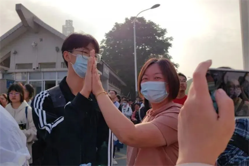 家长们也面带微笑、欢喜送考,击掌鼓励!