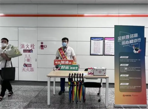 中河北路地铁站,工作人员为高考生精心准备口罩、矿泉水、文具、药物等贴心物品。