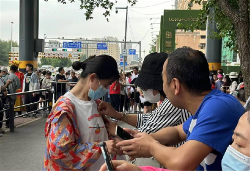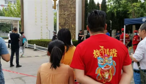 考生手持作答用具和准考证、身份证等物品有序进行排队,家长身穿红色衣服送考,为考生加油!