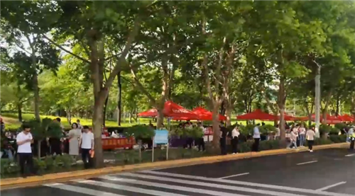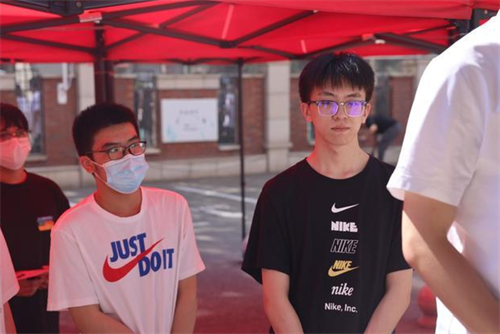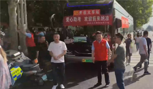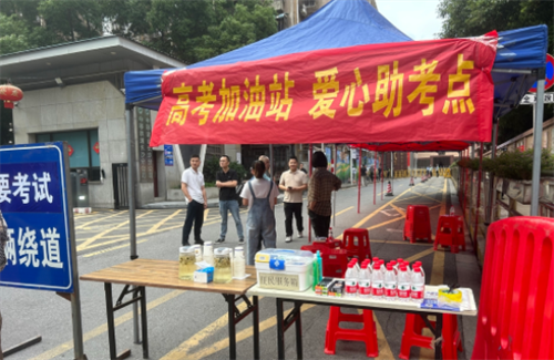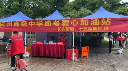 杭州高级中学考点西侧,街道和社区设立助考爱心加油站,为考生服务。