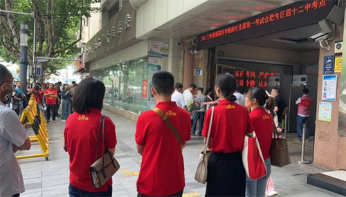 合肥42中考点门口,送考老师们都穿着红短袖,讨个好彩头。