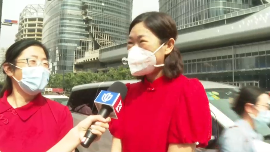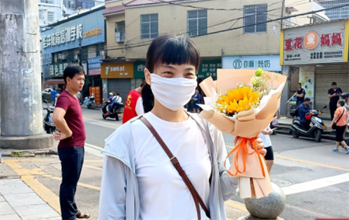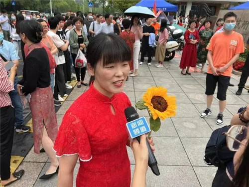 一位妈妈身穿红色旗袍,手拿一支向日葵特别引人注目,妈妈说是来为女儿送考的,希望她“一举夺魁,旗开得胜”。