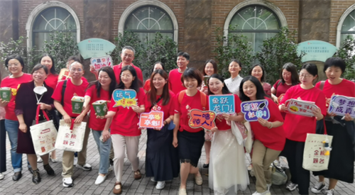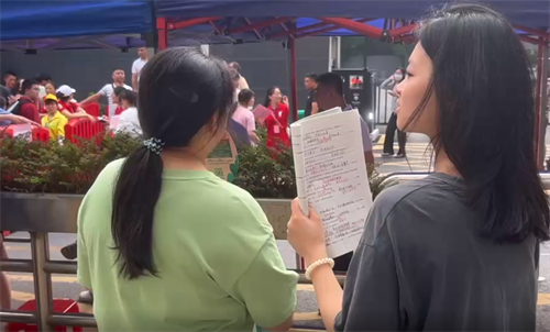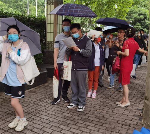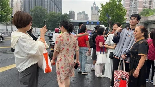 上海徐汇考区考场为妈妈着红色上衣为考生加油!