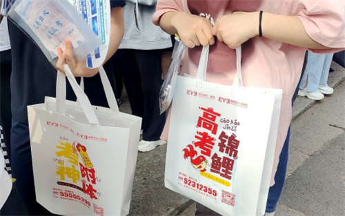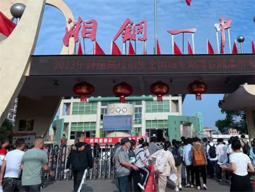 湘潭市三中考点,等在考点门外考生们拿着印有祝福字语的手提袋。