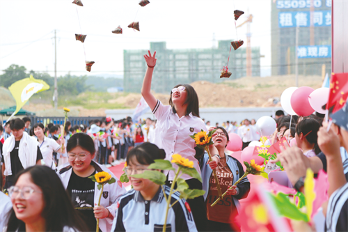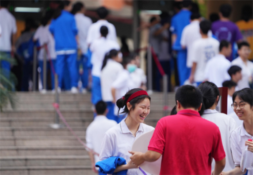 在南宁二中凤岭校区,老师和考生们击掌加油送祝福。