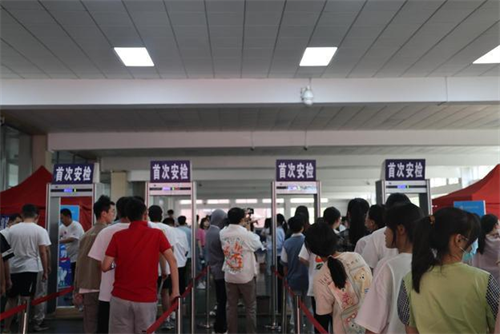 考生经过考点安保人员核验准考证、身份证后,进入安检通道。