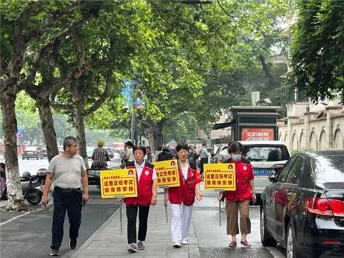 “武林大妈”举着“这里正在考试,请保持安静”的牌子在“巡街”,为考生尽绵薄之力。