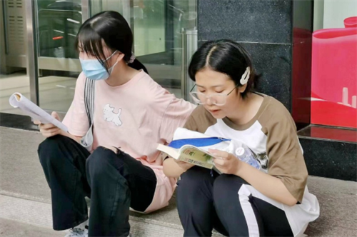 长铁一中考点,等待入场的两位小姐妹还在抓紧复习。