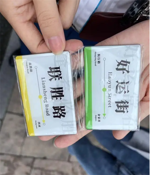 地铁站工作人员为学生家长送上象征美好寓意的地铁站站牌“好运街”“联胜路”。
