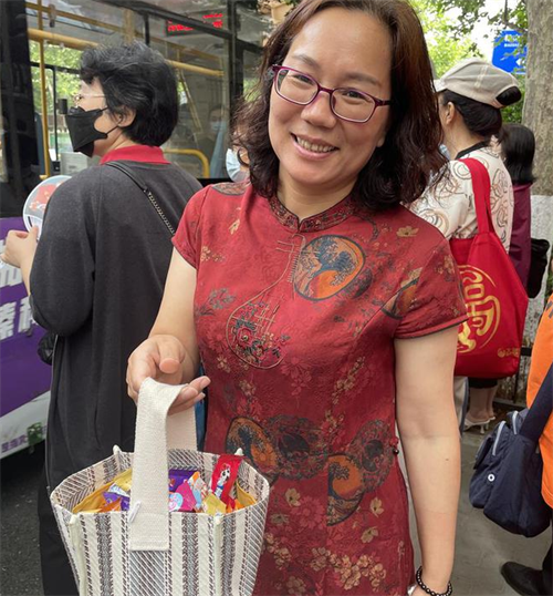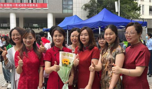 青岛六十六中老师在青岛旅游学校考点送考,不仅身穿红色旗袍还特意为考生准备了满满一袋子棒棒糖。