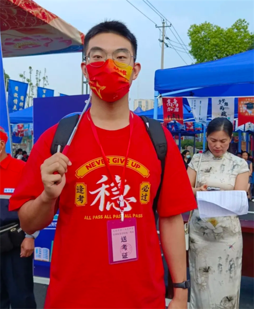 肥东县恺悦中学门口,考生家长自制一套红色“旗袍”为孩子高考助力。