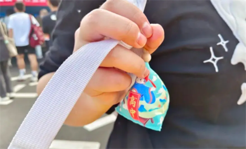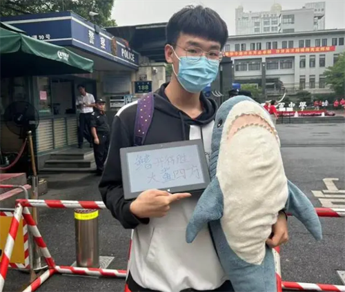 杭州考点外,高二同学,抱着一个大鲨鱼玩偶,来给学长学姐加油。他还送给大家一句谐音梗祝福:“鳍开得胜,大鲨四方。”