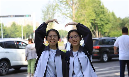 潍坊一中考点,一对双胞胎姐妹进入考场前比心加油。